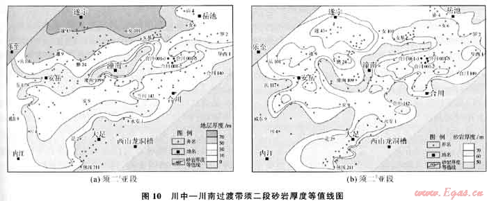 5) 各段沉積期主要的湖岸線位置有差異。總體上,川中北部地區(qū)須二段沉積期湖岸線大體位于龍崗-元壩一線,東部及東南部以碳酸鹽巖侵蝕凸起為界;須四段(須六段)的湖盆北部岸線大體位于龍崗-八角場一線,東部東南部湖岸線已達到現(xiàn)今重慶綦江-重慶璧山-四川廣安一帶;須六段沉積期東湖岸線更向東、向南擴展。