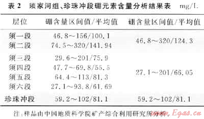 Couch[13]認為,沉積物中的硼(B)含量多少與水體鹽度有關(guān),即水體鹽度越高,硼含量就越大,沉積物吸附的硼離子就越多,故硼可以作為指示古水體鹽度的主要標(biāo)志。據(jù)Walker等(1963)研究認為黏土礦物中硼含量大于120mg/L為咸水;80~120mg/L為半咸水;小于80mg/L的為淡水。筆者近期對大川中及九龍山地區(qū)須家河組、侏羅系珍珠沖段地層采樣進行了微量元素分析,結(jié)果如表2所示。