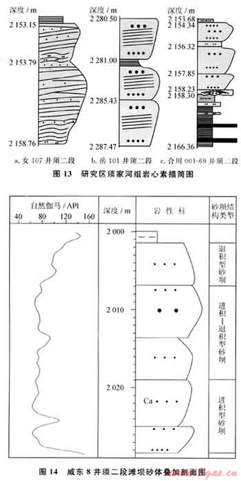 具正粒序的砂體,自然伽馬測井曲線常呈鐘形,往往被解釋為河流砂體,這是導(dǎo)致須家河組解釋為三角洲相的一個基本因素。經(jīng)巖心觀察及微觀研究,具鐘形形態(tài)的砂體除河流體外,另外是風(fēng)暴巖砂體和退積式砂壩(可能類似于羅啟后教授稱的水進河床砂)。退積式砂壩系指當(dāng)湖平面上升速度大于灘壩砂體加積速度時,灘壩砂體退積式沉積,其上部最終演化成湖盆細粒沉積物的粉砂坪或泥坪,亦可稱之為等效湖進灘壩。與這種退積式灘壩伴生的下部地層多為進積式的灘壩疊加體,而向上為較深水的泥巖(圖14)。