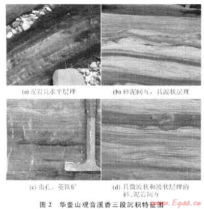 上述特征即使在可能鄰近湖泊邊緣的華鎣山觀音溪露頭剖面上也表現(xiàn)得很清楚。該剖面中的巖層被溪水沖刷得非常干凈,沉積特征十分清楚,香三、香五段以灰黑色泥頁巖為主,夾薄層灰色、灰質(zhì)細(xì)-粉粒砂巖。泥頁巖中水平和微波狀層理非常發(fā)育,其中時(shí)夾菱鐵礦條帶或菱鐵礦結(jié)核薄層,上部局部含豐富炭質(zhì)甚至成煤線;粉砂巖具有發(fā)育的波狀層理和豐富的蟲孔,普遍含灰質(zhì),局部成泥灰?guī)r團(tuán)塊或條帶,也夾有菱鐵礦條帶或串珠狀結(jié)核薄層(圖2)。