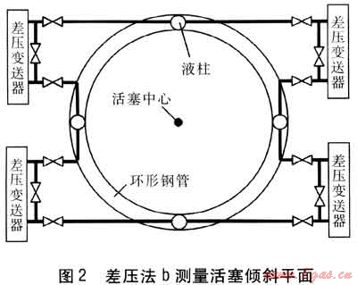 差壓法b測量活塞傾斜平面見圖2。在活塞上采用鋼管做一個大的圓環(huán),圓環(huán)的中心為活塞的中心位置,在圓環(huán)的4個等分位置設(shè)4個立管,所有立管和圓環(huán)皆連通,立管和圓環(huán)中均充有低揮發(fā)性的專用油品。將相鄰的兩個立管下部分別與差壓變送器的正負壓室相連,根據(jù)液柱的高差,計算得出傾斜量的大小。差壓變送器鄰近測壓點安裝。