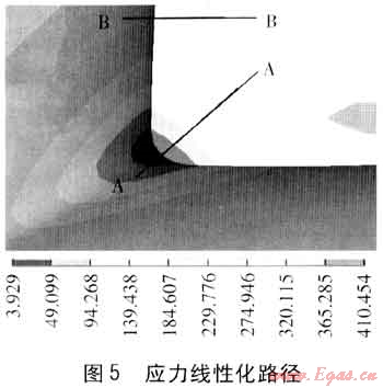 通過分析結(jié)果云圖可以查看管件應(yīng)力的分布情況。本例模型應(yīng)力最大點位于管件焊縫體內(nèi)側(cè),在最高工作壓力為4.0MPa時材料最大主應(yīng)力為410.454MPa。最大應(yīng)力點位于焊縫體內(nèi)側(cè)的圓角過渡處,該區(qū)域為整個模型受力最集中的區(qū)域且其他區(qū)域的應(yīng)力均遠(yuǎn)遠(yuǎn)小于該區(qū)域,故僅對該區(qū)域進行應(yīng)力評定和疲勞評定即可確定模型工作條件下的安全性。
