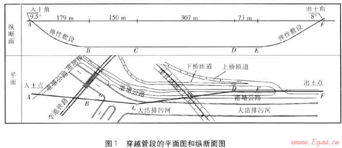 以大沽排污河水平定向鉆穿越工程為例,穿越管段的平面圖和縱斷面圖見圖1。大沽排污河穿越地點位于港塘公路與大沽排污河交口(港塘橋)附近,根據(jù)現(xiàn)場踏勘的情況來看,本工程要穿越港塘公路2次(港塘公路在此處為跨河倒“L”形走向)及李港鐵路、大沽排污河、津晉高速上、下橋匝道等幾處地上、地下構(gòu)筑物。