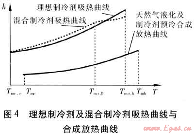 制冷劑在2.5~3.0MPa壓力(本文中壓力均為絕對(duì)壓力)及預(yù)冷終溫條件下已處于液態(tài),經(jīng)節(jié)流其壓力降至0.35~0.40MPa后,應(yīng)處于氣、液兩相狀態(tài),故制冷劑吸熱曲線斜率在冷箱的冷端大于合成放熱曲線在冷端的曲線斜率,理想制冷劑及混合制冷劑吸熱曲線與合成放熱曲線見圖4。