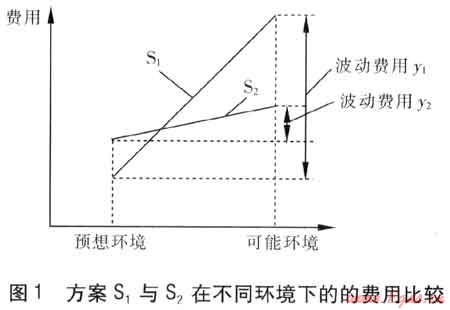 圖1中,波動(dòng)費(fèi)用是指當(dāng)預(yù)想環(huán)境變化至可能環(huán)境后,方案S1、S2為了適應(yīng)變化而增加的費(fèi)用??梢?jiàn)雖然在預(yù)想環(huán)境下S1比S2投資費(fèi)用省,但當(dāng)未來(lái)環(huán)境發(fā)生變化后,S1比S2付出了更多的追加費(fèi)用(y1-y2),因此S2比S1具有更好的靈活性與適應(yīng)性。柔性規(guī)劃的意義在于通過(guò)在規(guī)劃前期增加少量資金投入,使系統(tǒng)能夠更加適應(yīng)未來(lái)可能的變化,即無(wú)論未來(lái)環(huán)境如何變化,柔性規(guī)劃方案都能以較少的追加投入來(lái)適應(yīng)這種變化。采用柔性規(guī)劃方法總體上可以節(jié)省大量的資金和物資。