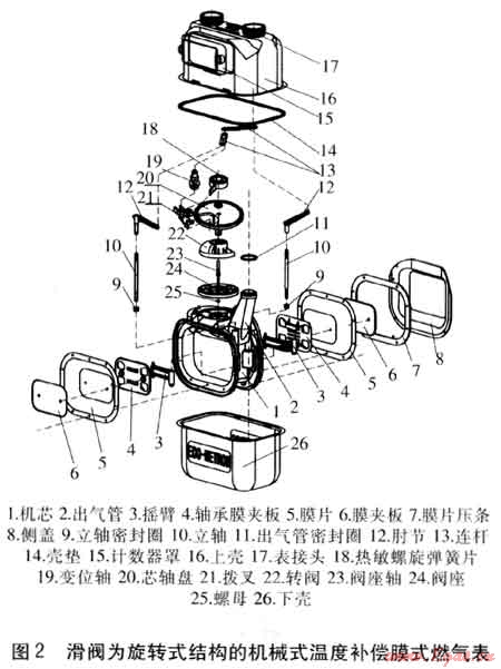 滑閥為旋轉(zhuǎn)式結(jié)構(gòu)的機(jī)械式溫度補(bǔ)償膜式燃?xì)獗硎切滦徒Y(jié)構(gòu),體積小,結(jié)構(gòu)簡(jiǎn)單緊湊,見(jiàn)圖2。