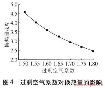 過??諝庀禂?shù)改變會影響煙氣進口溫度[2],也會引起煙氣流量變化,使煙氣側(cè)換熱效果發(fā)生變化[3]。保持其他參數(shù)不變,過??諝庀禂?shù)從1.5增至1.8。根據(jù)燃燒后煙氣總焓不變的原則,計算出不同過剩空氣系數(shù)下的煙氣溫度和煙氣流量,代入單管模型進行計算,計算的換熱量見圖4。過??諝庀禂?shù)每下降0.1,換熱量可增大20%左右。過剩空氣系數(shù)增大時,煙氣流量雖然增加,但因燃燒溫度降低使煙氣流速減小,hf減小,使傳熱量減小。故應在保證污染物排放不超標的前提下,盡量減小過??諝庀禂?shù)。