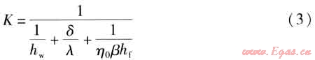 ③ 計算煙氣與水之間的傳熱系數(shù)K,計算公式為: