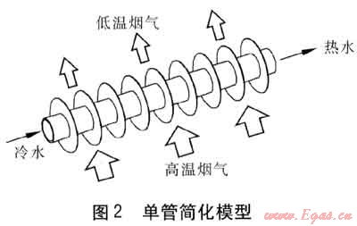 為簡化,將換熱器中嵌布的水管視作末端絕熱的肋片管,水管由若干(5或6)根肋片管依次串聯(lián)而成,肋片視作直管上的等截面環(huán)肋。高溫煙氣橫掠肋片管,將熱量傳遞給水管中流動的冷水。單管簡化模型見圖2。在相同的燃氣耗量和水流量下,水側(cè)溫升較大,則認為換熱效率較高,故可用出口水溫來衡量肋片管的換熱效率。本研究中比定壓熱容均取相應溫度范圍內(nèi)的平均值。