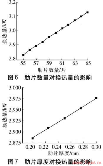 肋片厚度會影響肋片效率,也影響煙氣通道的面積,改變煙氣流速,進而改變換熱量。當肋片厚度增加時,肋片效率ηf增大,從而使煙氣側(cè)表面?zhèn)鳠嵯禂?shù)增大,換熱器的換熱效果增強。當肋片厚度從0.2mm變化至0.3m時,換熱量的改變見圖7。肋片厚度增加0.1mm,換熱量增加3%。