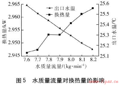 水質(zhì)量流量變化會引起水的流速變化,影響水側(cè)的傳熱系數(shù),也影響水與煙氣的換熱時間[4]。保持其他參數(shù)不變,水質(zhì)量流量從7.6kg/min變化到8.2kg/min,換熱量與出口水溫的變化見圖5。由圖5可知,水質(zhì)量流量增大,雖然出水溫度有所下降,但總的換熱量是增加的,換熱器換熱效率提高。可以考慮調(diào)節(jié)燃氣流量與調(diào)節(jié)水質(zhì)量流量相結(jié)合來進行燃氣熱水器的水溫控制,提升水溫小幅變化時熱水器的換熱效率。