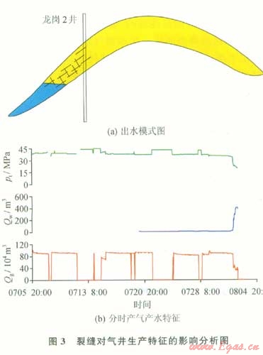 裂縫的高導流能力導致部分井在初期成為導流氣體的主流通道,隨著氣井持續(xù)超能力生產(chǎn)(圖3),很容易造成邊水及底層水高導進井筒,造成水竄,造成氣井暴性水淹。