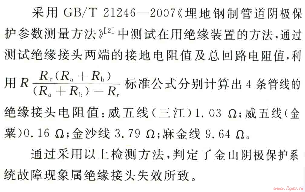 摘要:電絕緣裝置的作用是保障有限長管道上陰極保護的電流密度充分有效,同時隔斷與其他相連的金屬設(shè)備或構(gòu)筑物的電連接。實際生產(chǎn)中,管道輸送的氣質(zhì)中容易包含鹵水及沉積物,它們會吸附在管道金屬內(nèi)表面,形成導(dǎo)電介質(zhì),造成絕緣裝置失效,致使陰極保護效率降低。為此,對中國石油西南油氣田公司金山輸氣站所轄的4條管線的絕緣裝置電性能進行了檢測,分析了造成管道陰極保護絕緣失效的原因,發(fā)現(xiàn)絕緣裝置失效后的危害是可能造成管道陰極保護低效和管道腐蝕。進而提出了控制腐蝕的方法:從設(shè)計上將絕緣接頭放在不易積水的位置、施工安裝要避開低洼積水段、定期清管排污以防止管道電連接短路等。上述對策解決了長期困擾輸氣生產(chǎn)的技術(shù)難題。