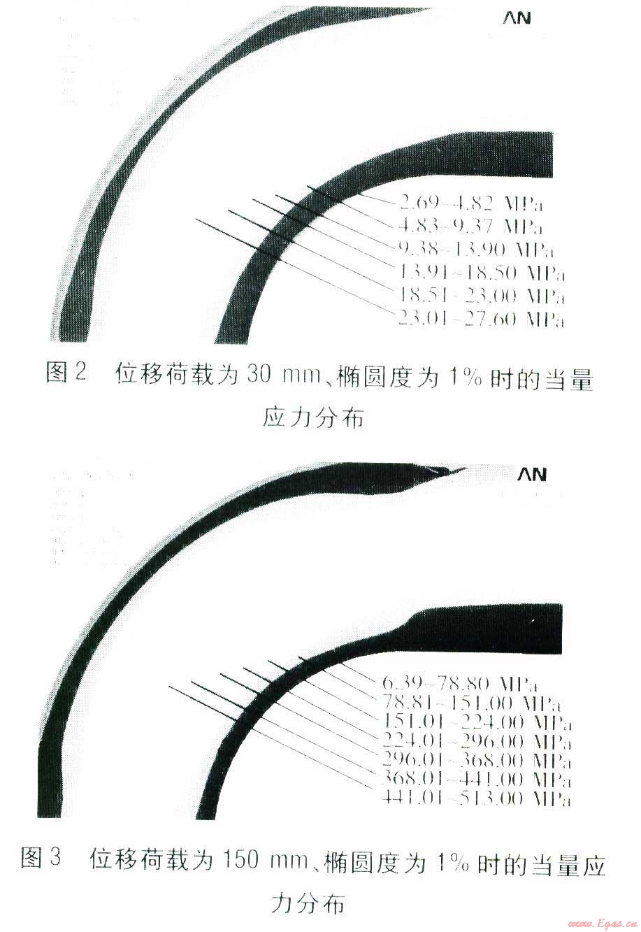 最高循環(huán)溫度為130℃,安裝溫度為l0℃,彎管內(nèi)表面施加l.6 MPa的壓力荷載。在對直臂施加不同位移荷載,以及不同橢圓度下對彎頭的當量應(yīng)力分布進行模擬。直臂分別施加l0、30、50、80、150、200 mm的位移荷載,橢圓度變化范圍為l%~20%。位移荷載分別為30、150mm、橢圓度為1%時的當量應(yīng)力分布見圖2、3,各個色塊的當量應(yīng)力范圍標注在圖中。由圖2、3可知,彎頭中線部位當量應(yīng)力最大。在對直臂施加不同位移荷載時,彎頭中線部位當量應(yīng)力不同。對直臂施加的位移荷載越大,彎頭所受當量應(yīng)力越大。