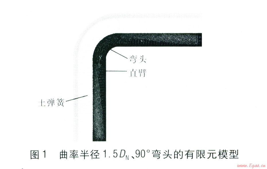在Pro/Engineer軟件中建立橢圓彎頭模型,并通過數(shù)據(jù)無縫連接的方法將模型導(dǎo)入ANSYS軟件中。在ANSYS軟件中對彎頭進行網(wǎng)格劃分,并施加彈簧一阻尼器單元,然后設(shè)置彎頭和土彈簧的參數(shù),再施加荷載進行求解。對彎頭的應(yīng)力有限元求解采用第四強度理論(形狀改變比能理論),第四強度理論認為形狀改變比能是引起材料屈服破壞的主要因素,無論何種應(yīng)力狀態(tài),只要構(gòu)件內(nèi)一點處的形狀改變比能達到單向應(yīng)力狀態(tài)下的極限,材料就要發(fā)生屈服破壞。由米塞斯(Mises)公式[8]65計算當量應(yīng)力??紤]到彎頭兩端直臂過長易降低軟件的運算速度,因此建模時彎頭兩端直臂長度只取5 m,熱伸長量均由位移荷載代替,將位移荷載施加到直臂兩端面上。采用20節(jié)點的Solid95實體單元劃分彎頭與直臂,彈簧-阻尼器單元COMBINl4用于模擬管-土相互作用下的土彈簧[10],對彎頭和直臂全部采用自由劃分后形成的網(wǎng)格方式[10]。曲率半徑1.5DN(DN為公稱直徑)、90。彎頭的有限元模型見圖1。