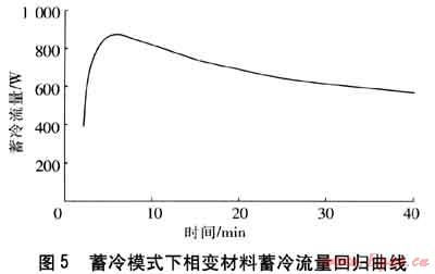 Φc與P之差即為相變材料蓄冷流量(回歸曲線見(jiàn)圖5),由于前2min實(shí)驗(yàn)數(shù)據(jù)不穩(wěn)定且存在Φc<P的情況,因此曲線從第2min給出。隨著運(yùn)行時(shí)間的推移,壓縮機(jī)逐漸穩(wěn)定運(yùn)行,制冷劑與相變材料的換熱流量不斷增大,初期提取的熱量為液態(tài)相變材料的液相顯熱,當(dāng)相變材料溫度進(jìn)入相變區(qū)間時(shí),制冷劑取出的熱量為相變潛熱。