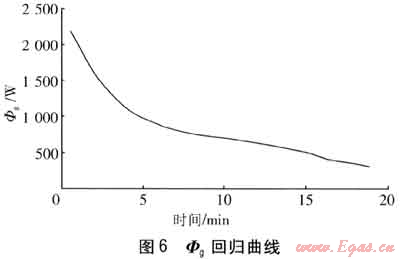 在蓄冷完成后,壓縮機(jī)停機(jī),立即開(kāi)始取冷實(shí)驗(yàn)。由實(shí)驗(yàn)結(jié)果擬合的Φg回歸曲線見(jiàn)圖6。由圖6可知,取冷實(shí)驗(yàn)持續(xù)時(shí)間為19min,在5~11min,Φg的變化相對(duì)前后兩個(gè)時(shí)間段要平緩,因此這一時(shí)段相變材料處于相變釋冷階段。在19min后,由于相變材料與熱水的溫差較小,因此釋冷緩慢,此時(shí)取冷量已經(jīng)達(dá)到蓄冷量的90%??紤]到取冷時(shí)間較短,以及存在熱損失等因素影響,因此可以基本認(rèn)定:三套管相變蓄能換熱器在蓄釋能過(guò)程中能量是基本守恒的。