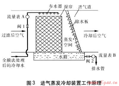 進(jìn)氣蒸發(fā)冷卻裝置工作原理見(jiàn)圖3。它由濕簾、布水器、除水板、水箱及一些附屬設(shè)備組成。其工作原理是:經(jīng)全膜法處理后的冷卻水經(jīng)閥1調(diào)節(jié)送至濕簾頂部的布水器后均勻地灑在濕簾表面,由于重力作用冷卻水自上往下如水簾灑下。空氣首先經(jīng)過(guò)濾器過(guò)濾,除去雜質(zhì),然后再進(jìn)入蒸發(fā)冷卻裝置,與濕簾中自上而下的冷卻水進(jìn)行熱濕交換。部分水因吸收空氣的顯熱汽化蒸發(fā)后變成水蒸氣,未蒸發(fā)的水流回水箱,排出后用于其他用途??諝庖蚴ワ@熱而溫度降低,同時(shí)因融進(jìn)了部分水蒸氣而使其相對(duì)濕度增加。空氣與水蒸氣的混合物流向下游的除水板,其中的小水滴和部分水霧在除水板上凝結(jié)成大水滴,并在重力的作用下落入水箱,降低了進(jìn)氣的攜水率,減少了壓氣機(jī)因進(jìn)氣空氣水量增加而導(dǎo)致的負(fù)荷消耗;同時(shí)空氣中的微小塵埃也隨水滴落入水箱,淋灑下來(lái)的冷卻水對(duì)空氣還起到了水洗除塵的輔助效果,避免了進(jìn)氣中的微量雜質(zhì)對(duì)燃?xì)廨啓C(jī)葉片的腐蝕。