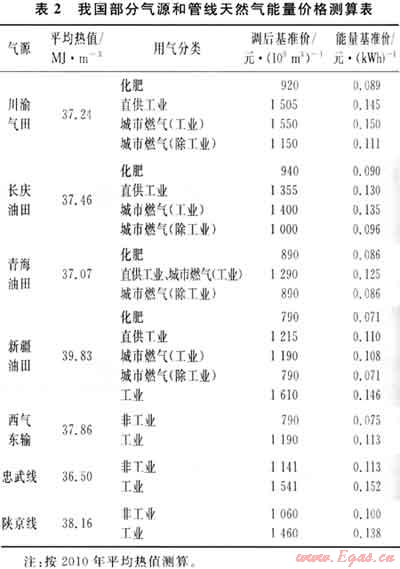 目前,我國(guó)天然氣出廠價(jià)格實(shí)行“政府指導(dǎo)價(jià)”,分生產(chǎn)區(qū)域制訂分用戶(hù)類(lèi)型(化肥用氣、工業(yè)用氣和城市燃?xì)?的結(jié)構(gòu)氣價(jià)。根據(jù)國(guó)家發(fā)展和改革委員會(huì)2010年6月調(diào)整0.23元/m3后的天然氣出廠價(jià)測(cè)算的能量基準(zhǔn)價(jià)格參見(jiàn)表2??梢钥闯觯芨鳉馓锾烊粴獍l(fā)熱量差異和價(jià)格水平差異影響,價(jià)格形式轉(zhuǎn)換后,各地區(qū)能量?jī)r(jià)格水平差別較大。