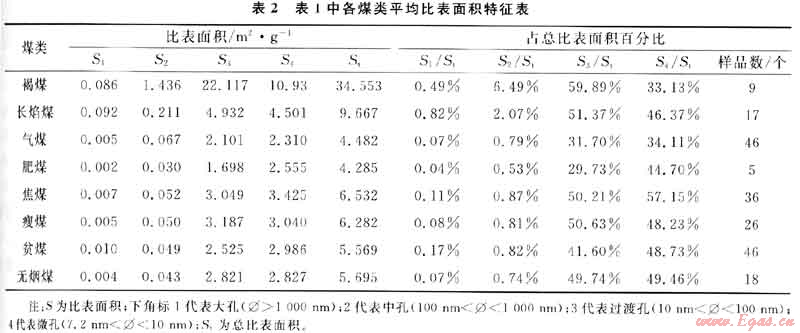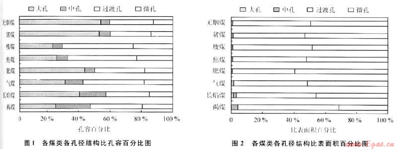 1) 華北地區(qū)褐煤、長(zhǎng)焰煤各孔徑結(jié)構(gòu)中比孔容分布較均勻,其他煤類(lèi)中大孔、過(guò)渡孔占較高比例,中孔不發(fā)育;各煤類(lèi)各孔徑結(jié)構(gòu)中比表面積微孔、過(guò)渡孔占絕對(duì)多數(shù)。