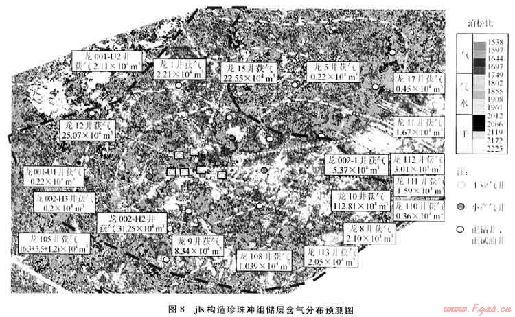 圖9為lg構(gòu)造二疊系生物礁儲(chǔ)層氣水分布預(yù)測圖。該圖展示,構(gòu)造中部北東南西向有一明顯分界線,西南(左下半部)為臺(tái)地相沉積區(qū),西北部為海槽,中間為臺(tái)緣。預(yù)測臺(tái)地為含水及差儲(chǔ)層區(qū),中間為臺(tái)緣部位,為預(yù)測的含氣帶,東北部為海槽,預(yù)測出大片含氣區(qū)。該構(gòu)造儲(chǔ)層段鉆探大量井位,前期在臺(tái)緣部位取得較好效果,高產(chǎn)井較多(黃色、綠色文字框所示),但后來鉆遇大量氣水井或水井(綠色或藍(lán)色文字框所示),尤其在臺(tái)地部位部署的井位基本上為干井或水井(白色或藍(lán)色文字框所示),獲氣井很少。氣水預(yù)測結(jié)果與實(shí)鉆結(jié)果基本吻合。預(yù)測還表明,該區(qū)海槽部位還有大片含氣區(qū),但該區(qū)僅有l(wèi)g10井鉆達(dá)目的層,且不產(chǎn)氣,雖然該井預(yù)測與實(shí)鉆吻合,但沒有更多的井來證實(shí),且該區(qū)儲(chǔ)層情況還存在認(rèn)識(shí)上的爭議,要靠將來的實(shí)鉆進(jìn)一步驗(yàn)證。