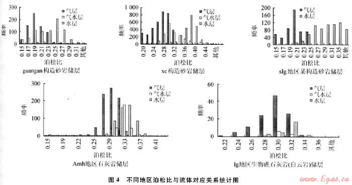 圖4為國內(nèi)外某些地區(qū)儲(chǔ)層泊松比測井資料與流體對應(yīng)關(guān)系統(tǒng)計(jì)圖。從圖中可見,盡管地區(qū)不同,儲(chǔ)層類型不同,但氣水關(guān)系始終具有一致特點(diǎn),即低泊松比對應(yīng)含氣,中泊松比對應(yīng)同含氣水,中高泊松比對應(yīng)含水,高泊松比對應(yīng)巖層。與前人研究成果都是一致的,只是具體儲(chǔ)層情況有分布范圍的差別。這也說明泊松比這些特點(diǎn)是由儲(chǔ)層及流體的物理性質(zhì)決定的,這種明確的關(guān)系確保了應(yīng)用泊松比進(jìn)行流體識(shí)別的可靠性。