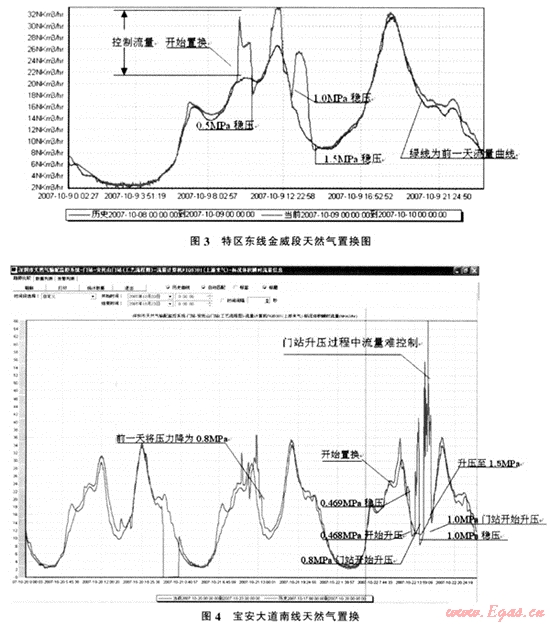 (3) 按有關(guān)規(guī)范的要求,置換時(shí)的流速應(yīng)控制在5m/s。通過粗略計(jì)算將流速控制折算成流量控制,建立流量控制表,通過SCADA系統(tǒng)門站瞬時(shí)流量,結(jié)合前一天的流量曲線,算出增量,將增量與流量控制表對(duì)比,及時(shí)通知現(xiàn)場(chǎng)進(jìn)氣閥門操作人員進(jìn)行調(diào)整。將流量控制在規(guī)范范圍。同時(shí)也保證了流量較為平穩(wěn),將對(duì)上游的影響降到最低。