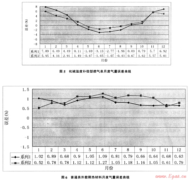 為了方便表格的編排,僅取4戶儀表的原始記錄進(jìn)行統(tǒng)計分析,分為機(jī)械溫度補償型和普通表外敷隔熱材料兩類,每類分為兩組,對每一組表統(tǒng)計到月度累積量和月度平均值。在表1和表2中,分別顯示了機(jī)械溫度補償型燃?xì)獗碓露葰饬空`差和普通表外敷隔熱材料月度氣量誤差,對應(yīng)于圖5和圖6,分別繪制了兩種儀表的溫度修正趨勢曲線。圖中可以清晰地觀察到儀表誤差隨時間(環(huán)境溫度1變化的趨勢,通過兩種不同的變化曲線,可以清晰觀察到兩種試驗情況下的溫度補償效果。