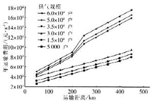 ?、谀赀\輸費用隨運輸距離線性變化,當(dāng)供氣規(guī)模在3×1O4戶以下時,斜率較小;當(dāng)供氣規(guī)模在3.5×104戶以上時,斜率較大,且在200 km和250km之間有一轉(zhuǎn)折。斜率差異主要是因為目前LNG汽車槽車型號少(國內(nèi)常用的LNG槽車容積主要為30 m3、40m3和45 m3),3×104戶以下供氣規(guī)模的氣化站每天所需的用氣量,單輛槽車每天運輸一次即能滿足。供氣規(guī)模超過3×104戶后,單輛槽車每天運輸2次或2輛槽車每天各運輸一次才能滿足氣化站每天所需的用氣量。出現(xiàn)轉(zhuǎn)折主要是因為建模過程中考慮到運輸安全性,規(guī)定槽車的行駛速度為70 km/h且單輛槽車每天在路上行駛的時間不超過13 h,因此當(dāng)運輸距離超過200km后,氣化站每天所需的用氣量由原先的單輛槽車每天運輸2次來滿足變?yōu)?輛槽車每天各運一次來滿足,從而年運輸費用中的槽車年折舊費用、保險費用等增加。