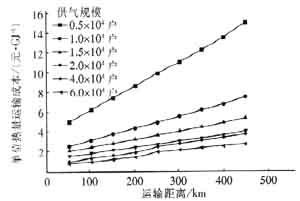 圖6 單位熱量運輸成本隨供氣規(guī)模的變化曲線