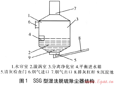 SSG型濕法脫硫除塵器主要包括水簾室、漩渦室、分離凈化室3部分,另配平衡進(jìn)水箱、清灰檢查門、沉淀池。SSG型濕法脫硫除塵器結(jié)構(gòu)見圖1。