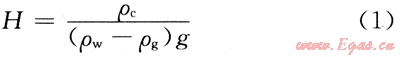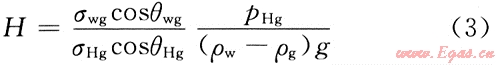 在毛細(xì)管壓力曲線上,一定壓力對(duì)應(yīng)的非潤(rùn)濕相飽和度相當(dāng)于氣藏中一定高度的含氣飽和度,因此,把毛細(xì)管壓力曲線的縱坐標(biāo)用自由水面以上的液柱高度來(lái)表示,就可以用該曲線來(lái)確定出氣藏中任意高度上的含氣飽和度,從而得出整個(gè)氣藏的氣水縱向分布特征。自由水面以上液柱高度的計(jì)算公式為: