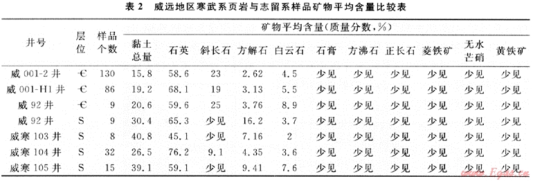 但比較四川盆地寒武系和志留系頁巖,筆者認(rèn)為,四川盆地頁巖氣勘探開發(fā)的首選目標(biāo)應(yīng)為川南志留系,理由如下:①盡管寒武系和志留系烴源巖都有較高的有機(jī)碳豐度和較好的有機(jī)質(zhì)類型,但志留系烴源巖的成熟度略低于寒武系。②運聚條件不同,志留系烴源巖在川南地區(qū)生烴強(qiáng)度大于川東地區(qū),但在川東地區(qū),石炭系直接覆蓋在志留系之上,由于石炭系有較好的滲儲條件,所以形成大中型氣田[5],而川南地區(qū)雖處生烴凹陷,但由于石炭系缺失,所以二疊系直接覆蓋在志留系之上,而二疊系孔隙不發(fā)育,滲儲空間主要為裂縫。已有的研究表明,二疊系甚至三疊系嘉陵江組都有天然氣來自志留系,但沒有形成向石炭系那樣的大氣田。顯然川南地區(qū)志留系排烴程度沒有川東地區(qū)高,換句話說,滯留在川南志留系中的天然氣應(yīng)當(dāng)較多。據(jù)不完全統(tǒng)計,川南地區(qū)鉆遇志留系有氣顯示的井有8口,也說明這一現(xiàn)象。寒武系生烴條件最好的地區(qū)是川西南地區(qū),而它受樂山龍女寺古隆起的影響較大,具備向震旦系輸氣的條件,也就是說它自身滯留天然氣的條件不如川南志留系。③礦物成分不同。從表2可見,威遠(yuǎn)地區(qū)寒武系頁巖的石英含量與志留系差不多,但黏土含量低于志留系的頁巖,而黏土與吸附氣的多少有關(guān),石英則與造縫能力相關(guān)。