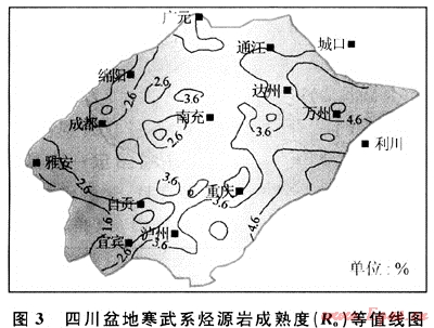 四川盆地下志留統(tǒng)泥質(zhì)烴源巖Ro值為2.2%~4.0%,已演化至過成熟階段。川南地區(qū)成熟度較低,普遍小于2.8%(圖7)。晚二疊世末,志留系源巖Ro值演化至0.9%,開始進(jìn)入成油期。三疊紀(jì)之后,由于沉積速度加快,志留系埋藏速率也相應(yīng)加快,志留系烴源巖在壓力和溫度作用下,熱演化加速。到中三疊世末時,很多地區(qū)的Ro值已迅速演化至1.3%。志留系烴源巖生成大量的液態(tài)烴。中侏羅世后,沉積作用仍然快速進(jìn)行,志留系地層仍處于快速埋藏狀態(tài),Ro值從1.3%迅速演化至2.2%,有機(jī)質(zhì)演化至高成熟期,處于濕氣轉(zhuǎn)化階段。從白堊系開始,大部分地區(qū)的志留系烴源巖有機(jī)質(zhì)R。值都超過了3%,進(jìn)入過成熟期,主要形成干氣。