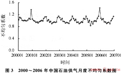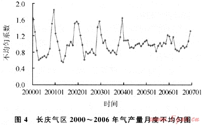 近幾年由于受國家經濟宏觀調控政策和城市環(huán)保要求提高等因素的影響,民用、發(fā)電等用氣增長較快,但民用和采暖用氣的季節(jié)性不均勻問題突出,冬季高月和夏季低月值相差很大。中國石油每年的1、2、3、10、11、12等6個月的不均勻系數偏大(不均勻系數為月產量與年均月產量的比值),最高為12月份,連續(xù)6a的12月不均勻系數都在1.2以上,2005年不均勻系數達到了1.54的高峰,峰谷差為1.3~1.5倍(圖3)[4~5]。