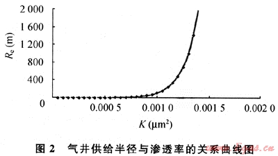 根據(jù)對不同滲流條件下的供給半徑定量研究表明(見圖2),滲透率小于1×10-3μm2的儲層,供給半徑在300m左右;當(dāng)滲透率大于1.2×10-3μm2時供給半徑就明顯增加。從圖2中看出:當(dāng)K介于1.2×10-3~1.4×110-3μm2,供給半徑為600~2000m;當(dāng)滲透率大于等于1.4×10-3μm2,供給半徑急劇增加,供給半徑在2000m以上。這說明氣藏的非均質(zhì)性對氣井供氣范圍影響大,井網(wǎng)密度應(yīng)不一樣。沙罐坪、云和寨北區(qū)、臥龍河石炭系氣藏大部分井滲透率小于1×10-3μm2,根據(jù)計(jì)算井距在300~2000km,從目前采出程度較高、非均質(zhì)性較強(qiáng)的福成寨、張家場石炭系來看,井距1~2km,從理論和實(shí)際開發(fā)效果對比認(rèn)為,沙罐坪、云和寨北區(qū)、臥龍河石炭系氣藏平均井距在1km左右為最好。