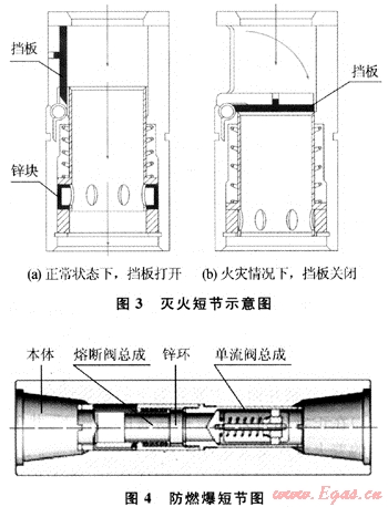 滅火短節(jié)(見(jiàn)圖3、圖4),即鉆柱防火接頭,這是一種低熔點(diǎn)合金制造的閥件,即滅火浮閥,閥內(nèi)裝有一個(gè)鋅環(huán)。在正常情況下,循環(huán)的空氣流動(dòng)壓力使彈簧瓣向下張開(kāi),允許空氣循環(huán)通過(guò)。一旦環(huán)空著火,溫度上升,當(dāng)超過(guò)設(shè)計(jì)溫度時(shí),低熔點(diǎn)合金鋅環(huán)熔化使一個(gè)襯套封住空氣流道,關(guān)閉閥門,停止向井底循環(huán)補(bǔ)充空氣,從而切斷氣源使火熄滅。