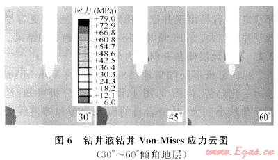 橫向比較分析不同傾角地層氣體鉆井和鉆井液鉆井的Von-Mises應(yīng)力變化趨勢(shì),由圖3、圖4、圖5、圖6綜合分析可見(jiàn):氣體鉆井井壁巖石在井底附近出現(xiàn)應(yīng)力集中,比鉆井液鉆井井壁巖石應(yīng)力值大,而且等值應(yīng)力分布面積更大,氣體鉆井比鉆井液鉆井更容易出現(xiàn)井壁不穩(wěn)定現(xiàn)象。氣體鉆井井底巖石相同等值線(xiàn)應(yīng)力區(qū)域面積較鉆井液鉆井應(yīng)力區(qū)域更深,巖石破壞范圍要大于鉆井液鉆井的破壞范圍,大大提高了破壞巖石效率和鉆井速度。在相同條件下,如果井眼軌跡發(fā)生偏斜,由于氣體鉆井具有較好的破巖效率,產(chǎn)生井斜可能性和幅度都更大。