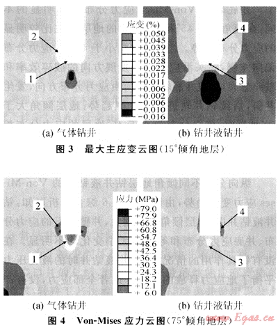 從圖2中2、4區(qū)井壁巖石的應(yīng)力分布可見(jiàn),井壁左側(cè)巖石的Von-Mises應(yīng)力值大于右側(cè)井壁巖石的應(yīng)力值,井壁巖石的應(yīng)力分布是不對(duì)稱(chēng)的,沿傾斜面的更高一側(cè)井壁應(yīng)力值更大。氣體鉆井中井壁巖石在井底附近出現(xiàn)明顯的應(yīng)力集中,Von-Mises應(yīng)力值最大為79MPa,而鉆井液鉆井在4區(qū)出現(xiàn)的井壁巖石應(yīng)力集中的Von-Mises應(yīng)力值約為70MPa。氣體鉆井在2區(qū)井壁巖石的應(yīng)力區(qū)域面積比鉆井液鉆井4區(qū)的等值應(yīng)力分布面積更大。由此可見(jiàn),相同的巖層和巖石強(qiáng)度,氣體鉆井的井壁比鉆井液鉆井時(shí)更容易成塊掉落,形成坍塌型井眼,造成鉆柱力學(xué)變化,改變井斜規(guī)律。從圖3中還可以看出,氣體鉆井1區(qū)主應(yīng)力大于3區(qū),說(shuō)明氣體鉆井條件下機(jī)械鉆速高,破巖速度也快。氣體鉆井2區(qū)沿左側(cè)井壁巖石比沿右側(cè)井壁巖石具有更大的拉應(yīng)變,如果巖石出現(xiàn)裂縫,將最先在左側(cè)出現(xiàn),而且較右側(cè)更大,巖石的破碎、跨塌將首先出現(xiàn)在左側(cè)。鉆井液鉆井出現(xiàn)相同趨勢(shì)的現(xiàn)象,但是井壁巖石有鉆井液的保護(hù),使得4區(qū)井壁巖石的應(yīng)變小而且分布均勻,其井壁穩(wěn)定性好,在相同巖石情況下,不會(huì)出現(xiàn)嚴(yán)重的坍塌型井眼,不會(huì)影響井斜的發(fā)展規(guī)律。由圖4可見(jiàn),氣體鉆井1區(qū)井底巖石應(yīng)力分布向右面偏斜,即沿向平行于傾斜面的方向偏斜,而鉆井液鉆井的偏斜趨勢(shì)基本相同,但不明顯。氣體鉆井的井底巖石相同等值線(xiàn)應(yīng)力區(qū)域面積較鉆井液鉆井的應(yīng)力區(qū)域面積更大。由于氣體鉆井破巖效率較高,使井眼的傾斜幅度也產(chǎn)生了放大的作用,破壞巖石后形成的井眼有向右面偏斜的趨勢(shì)。