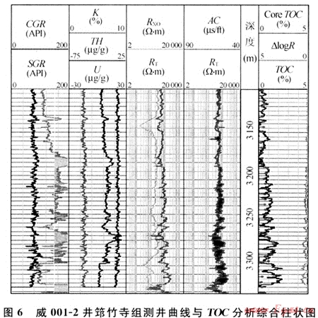 如前所述,隨深度的增加,筇竹寺組和龍馬溪組頁(yè)巖的顏色均具有自上而下逐漸加深的特點(diǎn),而其自然伽馬值和有機(jī)質(zhì)豐度也隨之逐漸增高(圖6)。威001-2是威遠(yuǎn)構(gòu)造上的一口新井,筇竹寺組的伽馬值在3175m以下明顯增加,一般都大于150API,而無論是根據(jù)測(cè)井曲線△㏒R(Passey,1989)計(jì)算的還是采用巖屑實(shí)測(cè)的TOC值,均顯示在該深度段以下一般都大于1.0%且逐漸增加的特征(圖6)。長(zhǎng)寧構(gòu)造上最近由中石油北京勘探開發(fā)研究院鉆探的1口淺井也顯示出龍馬溪組頁(yè)巖所具有的上述特征。該口淺井鉆遇了龍馬溪組中下部黑色頁(yè)巖層,110m深度段以上的TOC值一般在1.5%~2.5%之間,該深度以下TOC值劇增,均大于3%,最高約9%。