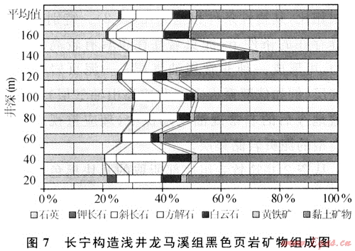 實(shí)際上,廣義的頁(yè)巖氣還應(yīng)該包括儲(chǔ)存在黑色頁(yè)巖所夾的薄層泥質(zhì)粉砂巖和各種砂巖中的天然氣。這些泥質(zhì)粉砂巖和砂巖相對(duì)純頁(yè)巖而言有較多的孔隙,因此儲(chǔ)存于其中的天然氣多為游離氣,可隨頁(yè)巖中的吸附氣一并采出。四川盆地這兩套黑色頁(yè)巖普遍含砂質(zhì),淺色石英粉砂微細(xì)紋層與暗色泥質(zhì)層交互沉積而顯水平紋理,石英分布不均,局部富集而成泥質(zhì)粉砂巖。此外,頁(yè)巖中還微含鈣質(zhì),底部多含硅質(zhì),黃鐵礦也較豐富,多呈星散狀分布。對(duì)長(zhǎng)寧構(gòu)造龍馬溪組黑色頁(yè)巖巖心樣品的礦物成分分析結(jié)果也表明,石英含量在20%~30%之間,方解石和白云石含量多在10%~25%,高者可達(dá)35%,黃鐵礦含量在1%~4%之間(圖7)。由于黑色頁(yè)巖砂質(zhì)和鈣質(zhì)較重,因此其性較脆、硬,在加砂壓裂中容易產(chǎn)生裂縫,這對(duì)于頁(yè)巖氣的開采極為有利。