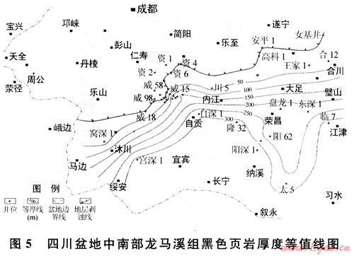 根據(jù)現(xiàn)有鉆井資料,筆者繪制了筇竹寺組和龍馬溪組黑色頁巖在四川盆地中南部的厚度分布圖。從圖4、5可以看出,除龍馬溪組黑色頁巖在古隆起頂部被剝蝕殆盡外,這兩套黑色頁巖在大部分區(qū)域內(nèi)均穩(wěn)定分布,厚度一般都在200m以上,而且均有向南或東南方向逐漸增厚的趨勢(shì)。