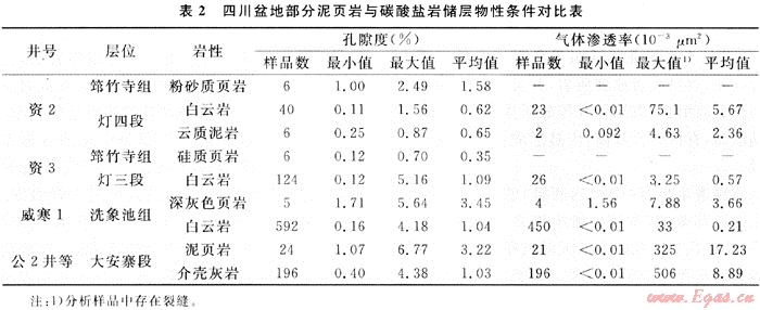 眾所周知,泥頁巖本身的孔滲性超低而致密,故一般在油氣藏的形成中起封蓋作用。但是,在四川盆地多套含油氣層系中,泥頁巖與同層的碳酸鹽巖儲(chǔ)層相比,其物性條件相差無幾(表2)。特別是在有裂縫存在的條件下,泥頁巖往往也具有較高的滲透能力,可形成·種非常規(guī)油氣層——泥頁巖裂縫性油氣層(例如侏羅系大安寨和涼高山油氣層)。在四川盆地今后的非常規(guī)油氣勘探中,理應(yīng)重視這種特殊類型的泥頁巖儲(chǔ)集層。
