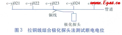 為了得到管道任意位置的陰極保護(hù)數(shù)據(jù),包括定向鉆穿越段中間部位、丟失的測(cè)試樁、占?jí)簾o(wú)法打開(kāi)的測(cè)試井等處的陰極保護(hù)數(shù)據(jù),擬采用拉銅線和極化探頭相結(jié)合的方法進(jìn)行測(cè)試。為了驗(yàn)證該方法的可靠性及準(zhǔn)確性,選取c-yj024測(cè)試樁作為管道上任意測(cè)試點(diǎn)。步驟為: