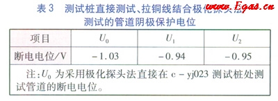 b.采用極化探頭法,在c-yj024測(cè)試樁上直接測(cè)試c-yj024測(cè)試樁處管道斷電電位U(測(cè)試方法見(jiàn)圖2),測(cè)試數(shù)據(jù)見(jiàn)表3,測(cè)試數(shù)據(jù)用來(lái)比對(duì)分析拉銅線結(jié)合極化探頭法的準(zhǔn)確、可靠性。