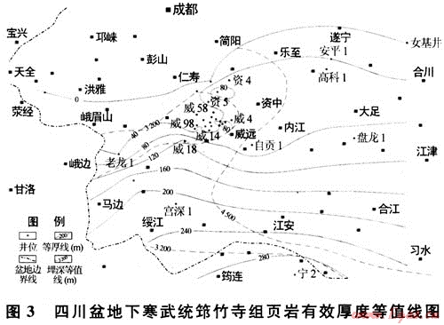 頁巖厚度的確定是頁巖氣資源評價的基礎,方法是根據(jù)沉積環(huán)境、巖性特征、結構組成等因素,將目的層中黑色頁巖劃分出來,單獨進行統(tǒng)計。首先根據(jù)區(qū)域地質、地震、鉆井等資料分析四川盆地下寒武統(tǒng)筇竹寺組頁巖系統(tǒng)的區(qū)域展布規(guī)律,確定和劃分頁巖系統(tǒng),對頁巖系統(tǒng)中的黑色頁巖、碳質頁巖、黑灰色粉砂質和砂質頁巖統(tǒng)計成圖。其次,在此基礎上,依據(jù)有機碳含量、熱成熟度、鉆井氣顯示等特征,確定有效頁巖厚度(圖3)。四川盆地西南部地區(qū)筇竹寺組有效頁巖面積約55828km2,有效厚度20~300m,盆地南部邊界寧2井區(qū)厚度最大(約450m)。為便于頁巖氣資源估算后的進一步經(jīng)濟評價,對不同埋深下的有效頁巖面積做了統(tǒng)計,埋深大于4500m的有效頁巖面積為27425km2,埋深4500~3200m的有效頁巖面積20684.2km2;埋深小于3200m的有效頁巖面積7718.8km2。