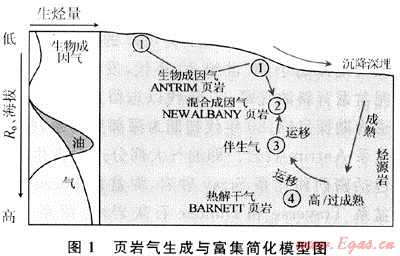 從石油地質(zhì)觀點(diǎn)看,烴源巖經(jīng)過(guò)一系列地質(zhì)條件作用生成大量天然氣,并在持續(xù)壓力作用下大量排出,向滲透性地層如砂巖和碳酸鹽巖運(yùn)移、聚集成構(gòu)造或巖性氣藏,而殘留在細(xì)粒沉積巖層系中的部分形成頁(yè)巖氣資源[10]。其中很大部分吸附在有機(jī)質(zhì)和黏土礦物表面,與煤層氣相似,另一部分以游離狀態(tài)儲(chǔ)集在基質(zhì)孔隙和裂縫孔隙中,與常規(guī)儲(chǔ)層相似,二者構(gòu)成比例取決于多種地質(zhì)作用過(guò)程,商業(yè)開(kāi)發(fā)前后的一系列研究和實(shí)踐也因此變得更復(fù)雜。
