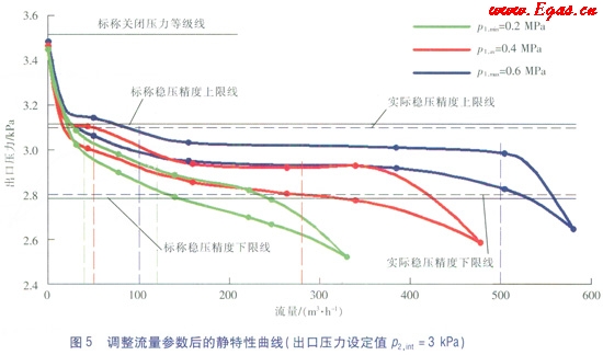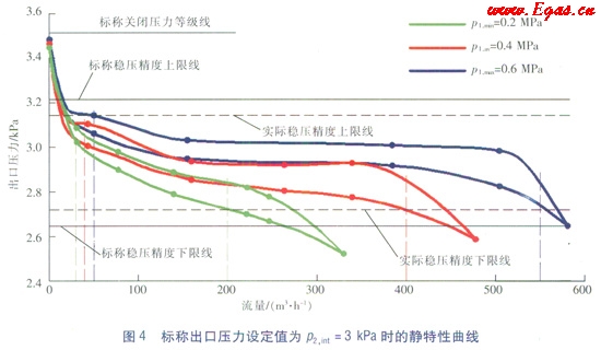 調(diào)壓器A在上述標(biāo)稱出口壓力設(shè)定值p2,int=3kPa參數(shù)條件下的靜特性曲線圖見圖4。