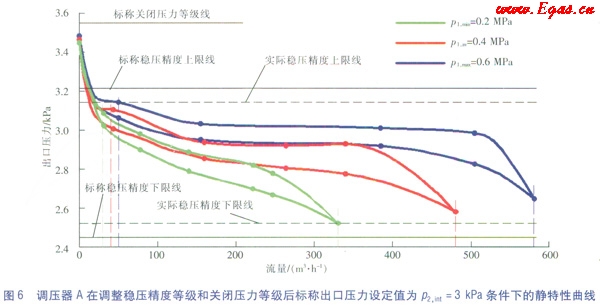以標(biāo)稱出口壓力設(shè)定值p2,int=3kPa為例(調(diào)整參數(shù)后的靜特性曲線圖見圖5),調(diào)整流量參數(shù)后,調(diào)壓器A在標(biāo)稱出口壓力p2,int=3kPa條件下的實(shí)際穩(wěn)壓精度為Ac,a=4.97<5(圖5中的實(shí)際穩(wěn)壓精度等級線與標(biāo)稱穩(wěn)壓精度等級線幾乎重合,為了使圖線得以區(qū)分,圖5在繪制過程中進(jìn)行了適當(dāng)放大處理,將實(shí)際穩(wěn)壓精度等級線與標(biāo)稱穩(wěn)壓精度等級線的間距適當(dāng)加大);實(shí)際關(guān)閉壓力等級為Sg,a=17.31<20;三條靜特性曲線的實(shí)際關(guān)閉壓力區(qū)等級分別為:p1=0.2MPa時(shí)Sz,a=19.23<20,p1=0.4MPa時(shí)Sz,a=6.67<20,p1=0.6MPa時(shí)Sz,a=5.52<20;實(shí)際靜特性曲線族的關(guān)閉壓力區(qū)等級為Sz,p,a=19.78<20。