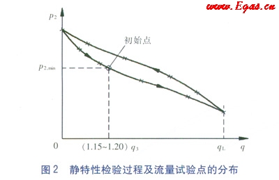 初始狀態(tài)設(shè)定完畢后的靜特性檢驗(yàn)過程及流量試驗(yàn)點(diǎn)的分布如圖2所示(以標(biāo)稱出口壓力設(shè)定值為p2,min為例)。